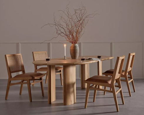 The armless dining chair with PU upholstery seat and rattan cane back is a stylish and comfortable piece of furniture that would make a great addition to any dining room. The chair features a sturdy frame made of high-quality materials, with a sleek design that allows it to fit seamlessly into any decor. The seat of the chair is upholstered in a soft and durable PU material that is both comfortable and easy to clean. The seat provides ample support and cushioning, making it a comfortable spot to sit for extended periods of time. The back of the chair is crafted from rattan cane, which adds a natural and rustic element to the design. The intricate weaving of the cane creates a beautiful pattern that adds texture and visual interest to the chair. Additionally, the open design of the rattan cane back allows for airflow, ensuring that the chair remains cool and comfortable even during long meals.