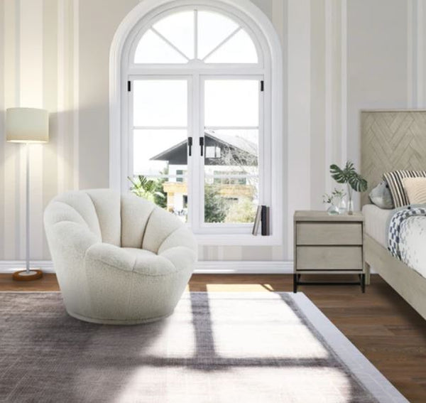 Stylish oversized lounge chair featuring a round design, wrapped in luxurious Bouclé fabric for comfort and elegance, complete with a swivel base for added functionality.
