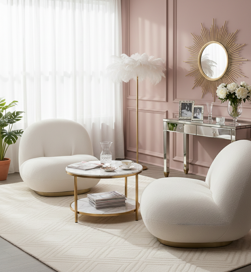Elevate your free time and move with effortless ease in this stunning accent lounge chair. This Lounge Chair features graceful curves that slope gently downward as handcrafted details create a visual cascade of elegant vintage glamour. Complete with soft premium boucle upholstery and medium foam padding, this chair comes with a plush design perfect for a luxurious seating experience. Enjoy the entirety of your surroundings with this upholstered accent chair perfect for your living room, entryway, bedroom, or lounge area.