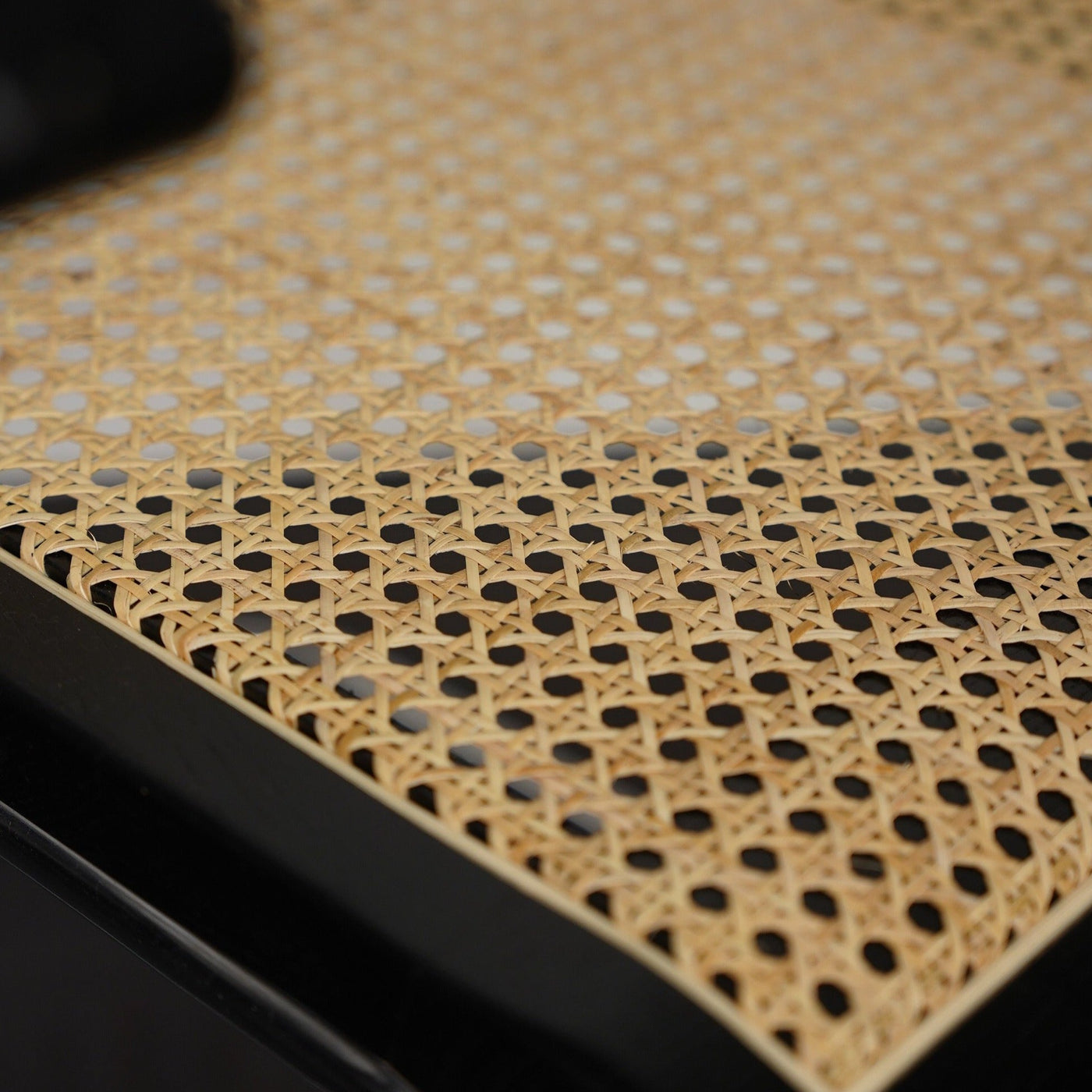 New dining chair made of natural rattan, black beech wood frame, and chromed legs.