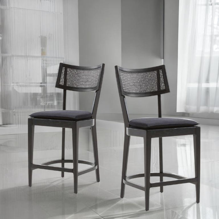Sleek wood counter stool featuring a black cane back, a removable black cushion, and a solid wood frame with a black stained finish—perfect for modern and classic interiors alike.