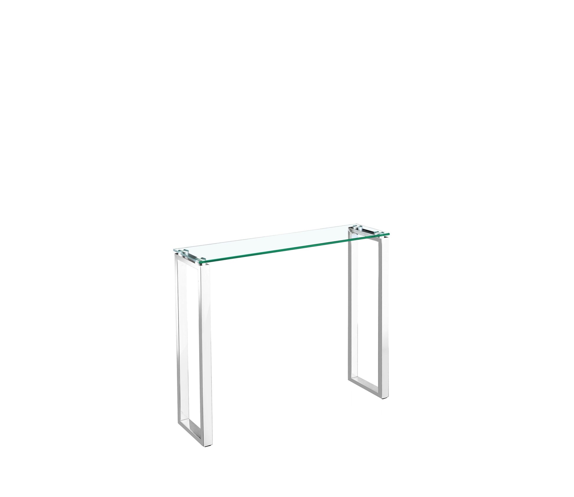 Modern console made of 10mm tempered clear glass and stainless steel tube leg.