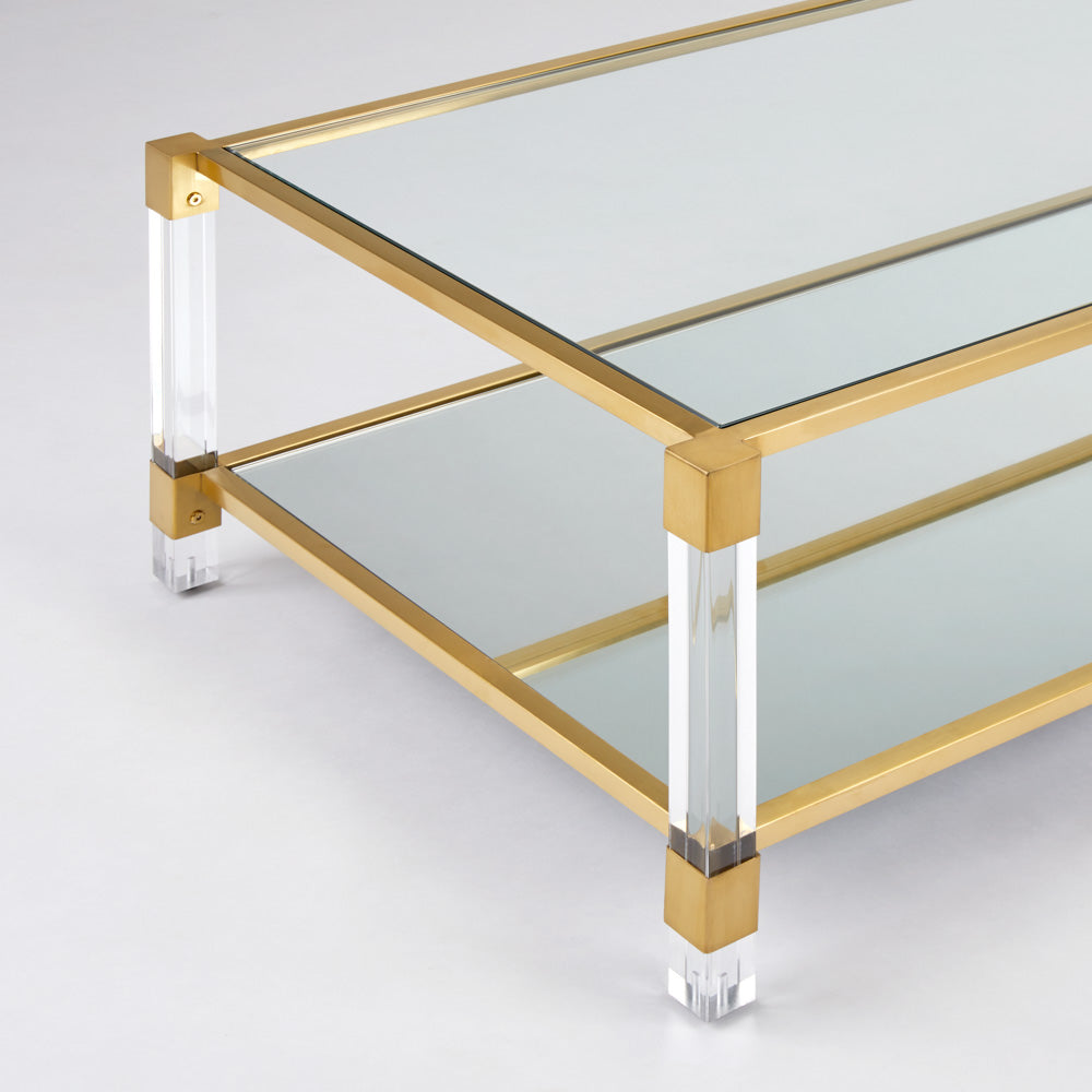 Introducing our sleek and modern coffee table, a stunning blend of style and durability. Crafted with tempered glass shelves, this elegant piece exudes sophistication while providing a sturdy surface for your coffee, books, and decor. The transparent acrylic legs lend an ethereal touch, creating an illusion of floating elegance. Accentuated with steel details, this coffee table adds a contemporary edge, combining strength and elegance seamlessly. Elevate your living space with this exquisite fusion of tempered glass, acrylic, and steel, and enjoy the perfect centerpiece for your conversations and relaxation.