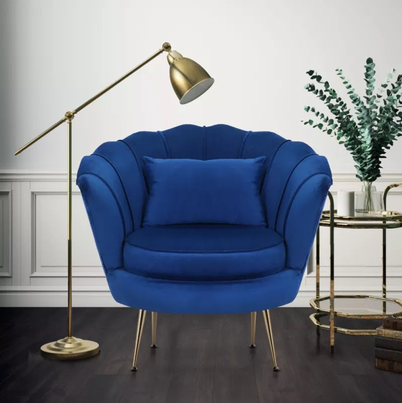 Elegant lounge chair made of wooden frame, velvet upholstery and shiny gold legs.