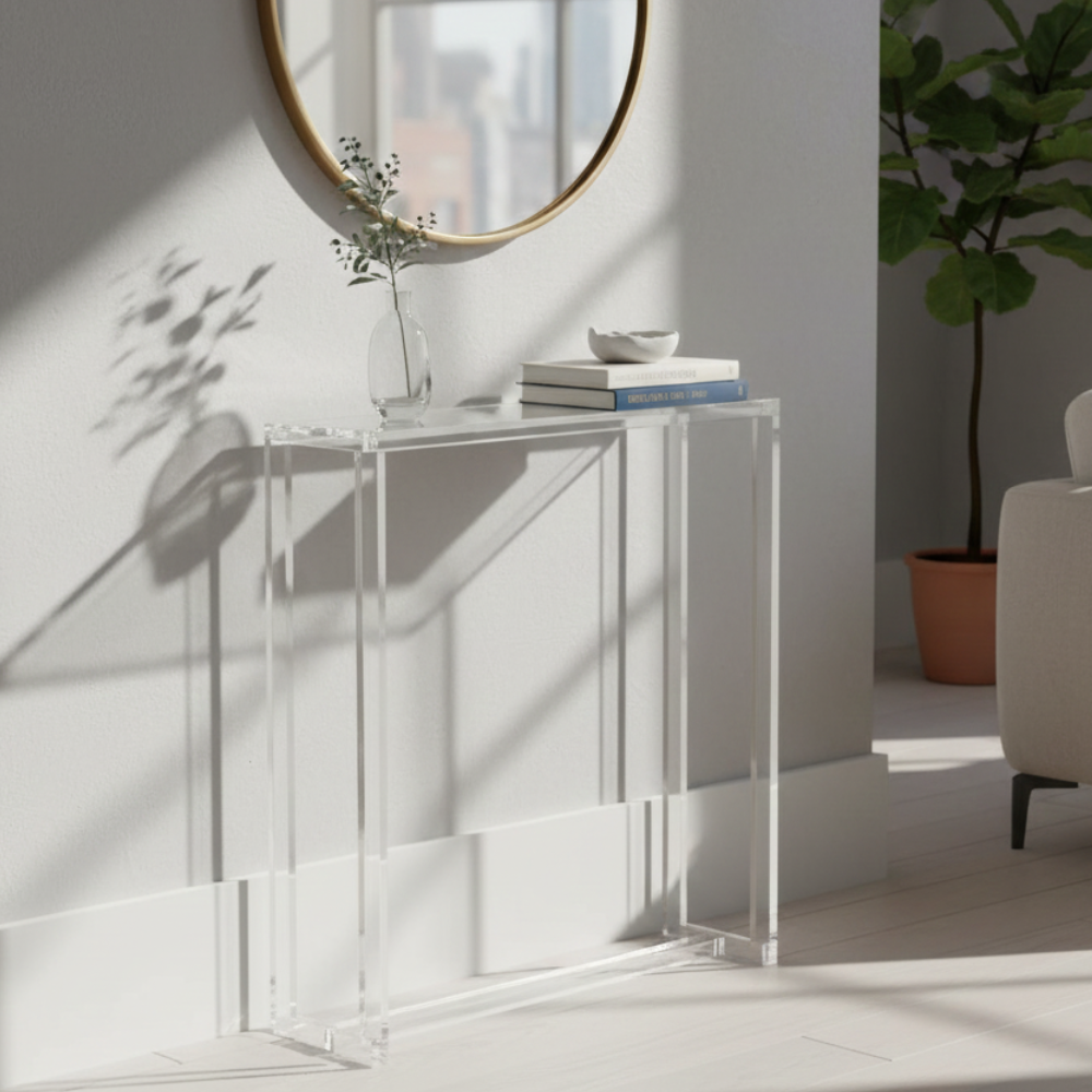 Stylish console made of acrylic with an unique design and clear finish . These contemporary tables will bring glamour and functionality anywhere they stand