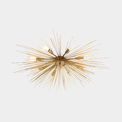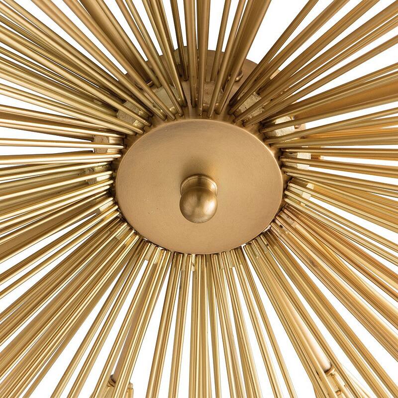 Illuminate your space with the elegant Sunrise Flush Mount. Crafted from steel with an antique brass finish, this unique chandelier creates a stunning light and shadow display with eight frosted globe bulbs. Bring a touch of sophistication to any room.